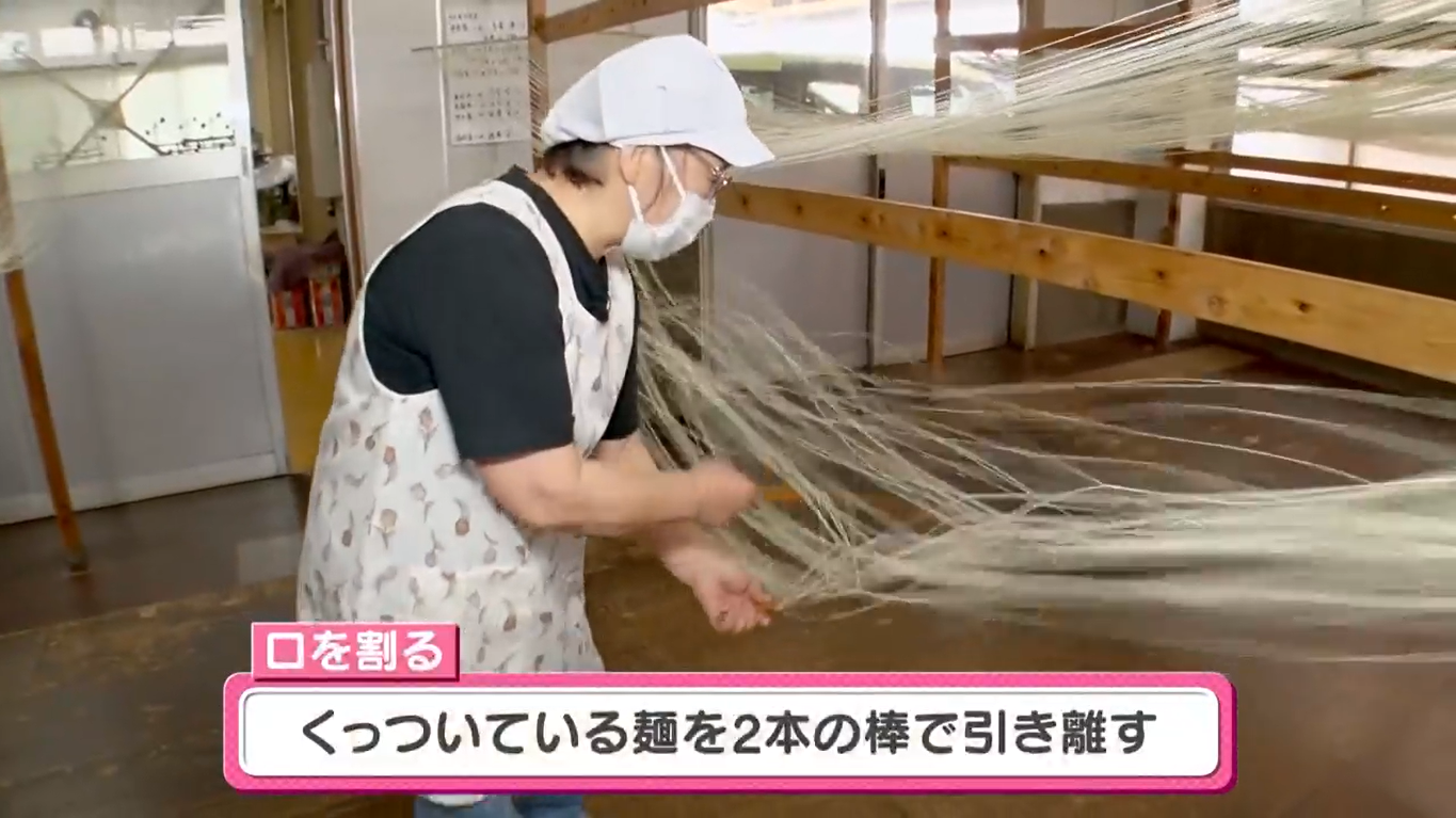 麺をのばしたあとは、くっついている麺を1本ずつに引き離す“口を割る”作業へ。麺と麺の間に棒を入れて、揺らしながら割いていきます。繊細な動きは、まさに職人技!