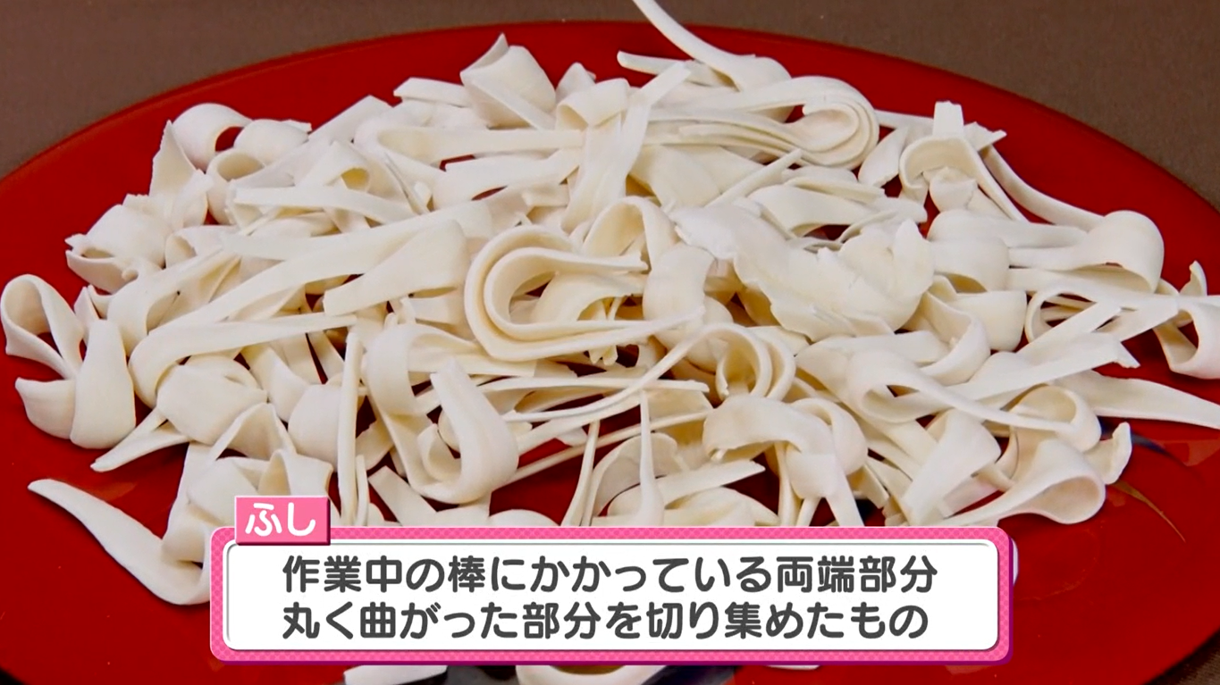 最大までのばしたそうめんは、両端でカット。その際、作業中に棒にかけられていた部分、丸く曲がった両端を集めたものは“ふし”と呼ばれます。