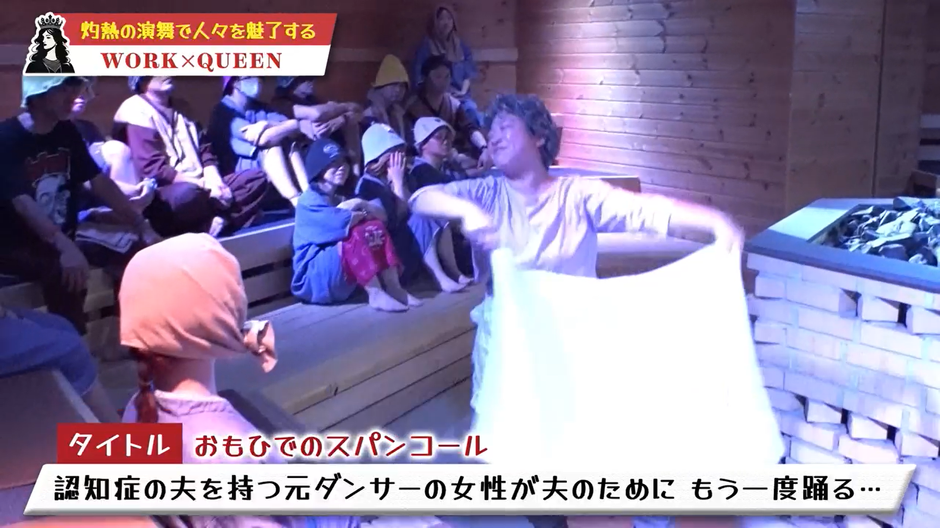 早速、サウナ内で佐野さんのパフォーマンス「おもひでのスパンコール」を体験。認知症の夫を持つ元ダンサーの女性が、夫のためにもう一度踊るという物語です。