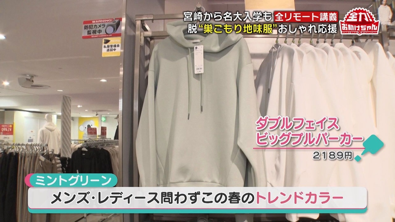 まずはトップスにメンズ・レディース問わずこの春のトレンドカラー“ミントグリーン”の『ダブルフェイスビッグプルパーカー(2,189円)』をチョイス。春っぽくもなり、爽やかでクールな印象にもなる万能アイテムだそうです。