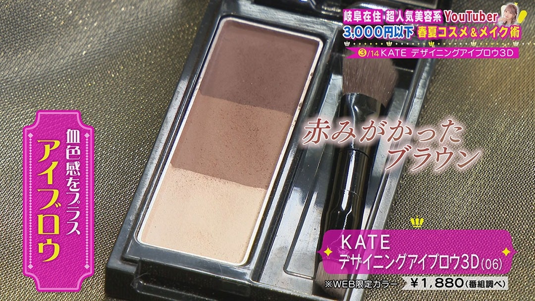 コスメ・美容の総合情報サイトで1位を獲得した人気アイテムが、『KATE デザイニングアイブロウ3D(06)』(1,880円 番組調べ)。中でもオススメのカラーは、WEB限定カラーの赤みがかったブラウン。
