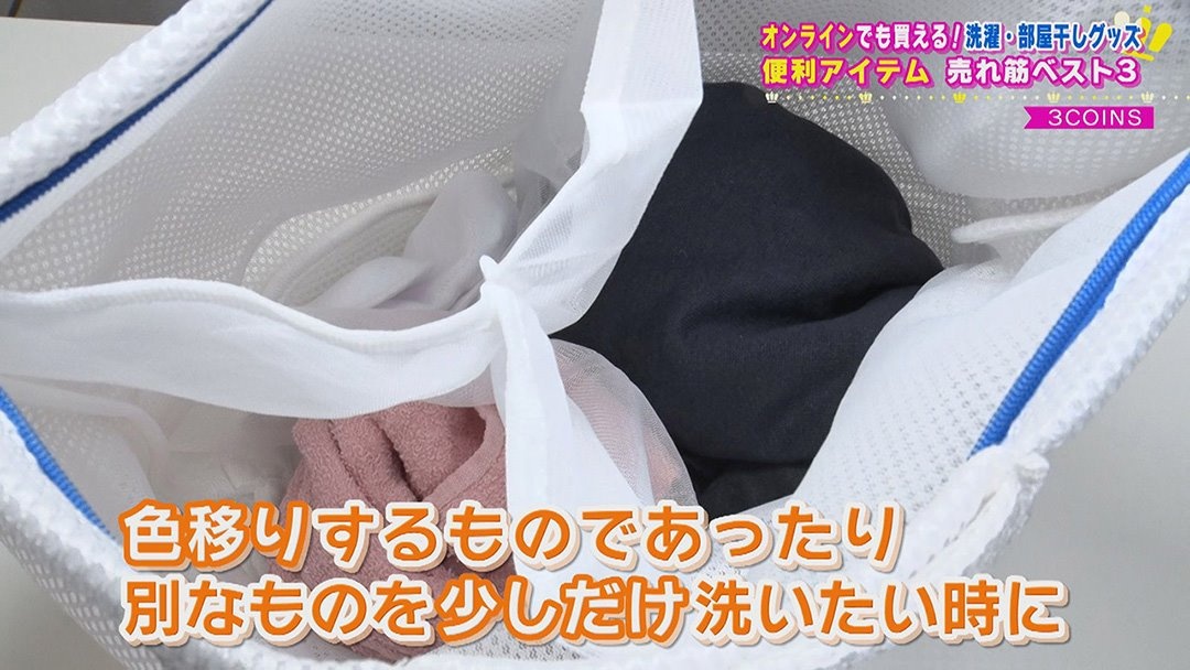 『3ポケット ランドリーネット』(330円 オンラインストア有)は、ネットの中が3つに分かれているため、色移りするものや素材別に少しだけ洗いたいときに分けて入れられます。小さなネットに1つ1つ入れるよりも便利ですよ。