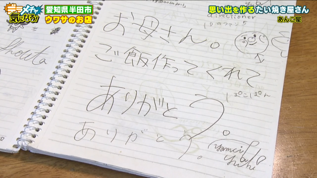 「来店記念に好きなことを書いていってね」と表紙に書かれたノート。個人情報以外なら何でも書いていってほしいと8年前からお店に置いているそうです。ノートを開くとまず目に入ったのがお母さんに書いたメッセージ。
