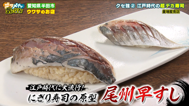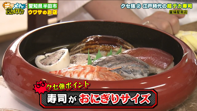 思わず「でっかー!」「おにぎりじゃん!」と叫んでしまうほど超巨大なお寿司!1つ1つが通常のお寿司の3倍ほどのサイズになっています。分厚いネタにおにぎりのようなシャリのこのお寿司、実は江戸時代に大流行していた握り寿司の原型にあたる『尾州早すし』。実際の江戸時代の寿司はこれよりもさらに大きかったそうで、今のおにぎりのように1個2個食べてお腹を膨らませるものだったとのことです。
