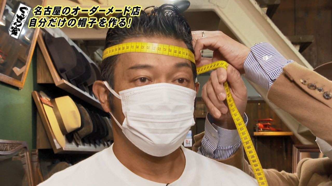 「僕の頭けっこうハチが大きいんで…ないんですよ!『いいな』と思っても小っちゃいっていうのがあるから」と悩みを打ち明けるぐっさん。代表の山田さんに測ってもらうとサイズはLL!