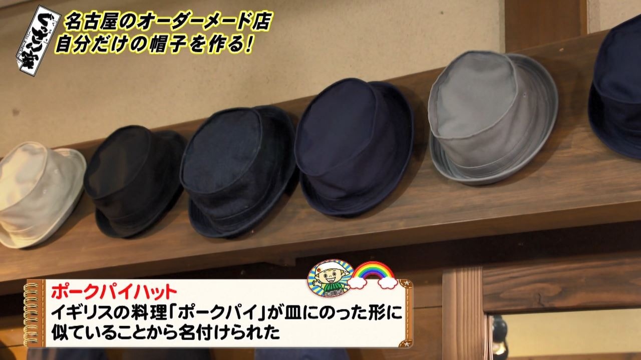 続いては帽子の型選び。店内にはハンチングやキャスケットなど様々な帽子がズラリと並びます。中でもぐっさんが注目したのが『ポークパイハット』という帽子。