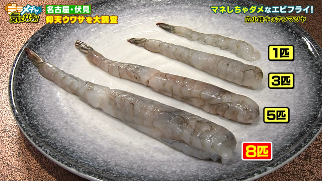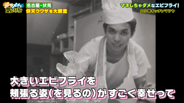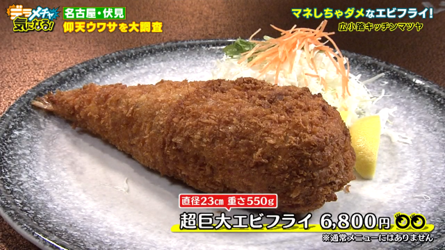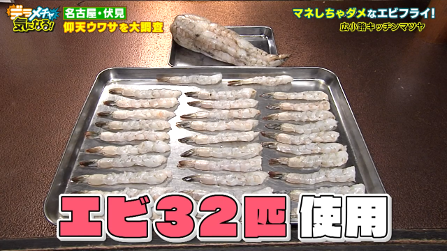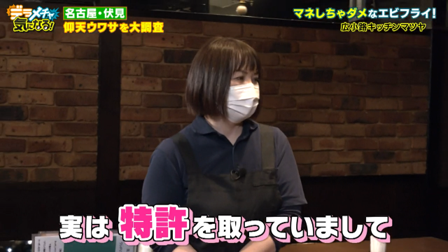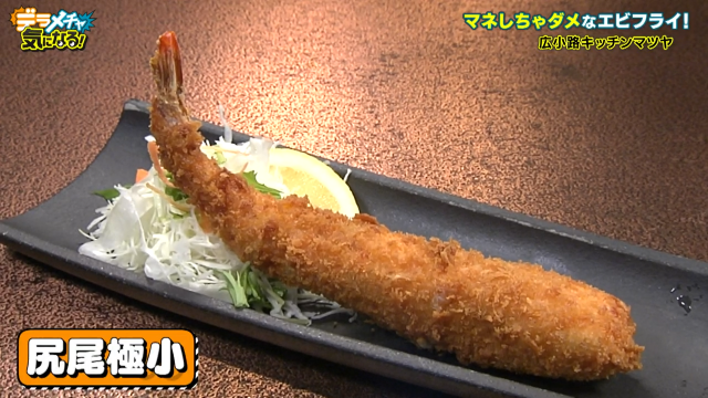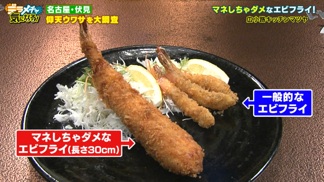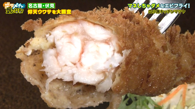 中はエビがぎっしり!!! 衣ではなく、エビがちゃんと全部ぎっしり詰まっていました! これには村上も「こんな大きいエビフライ食べたのはじめて!」と大感動です。見た目よし味よしのエビフライはキッチンマツヤの大人気メニュー『特選一尺太エビフライ』。しかしこのエビフライ、実はマネしてはいけないんです。いったい何故なのか? ウワサの真相を尋ねてみると、店長の仲江亜咲奈さんから驚きの答えが返ってきます。