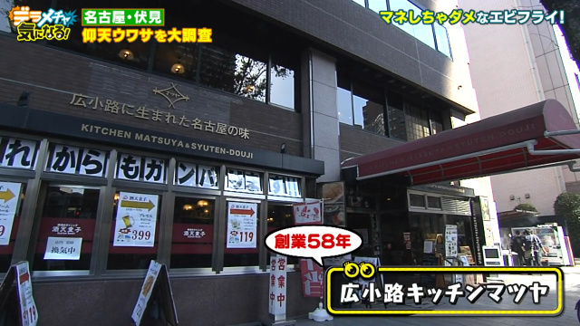 はるなと村上が最初に訪れたのは伏見駅すぐ近く、広小路通り沿いにある洋食店『キッチン マツヤ』。創業58年を数える老舗に「マネしちゃダメなエビフライがあるらしい」とのウワサがあるそうで、早速お店を訪問します。