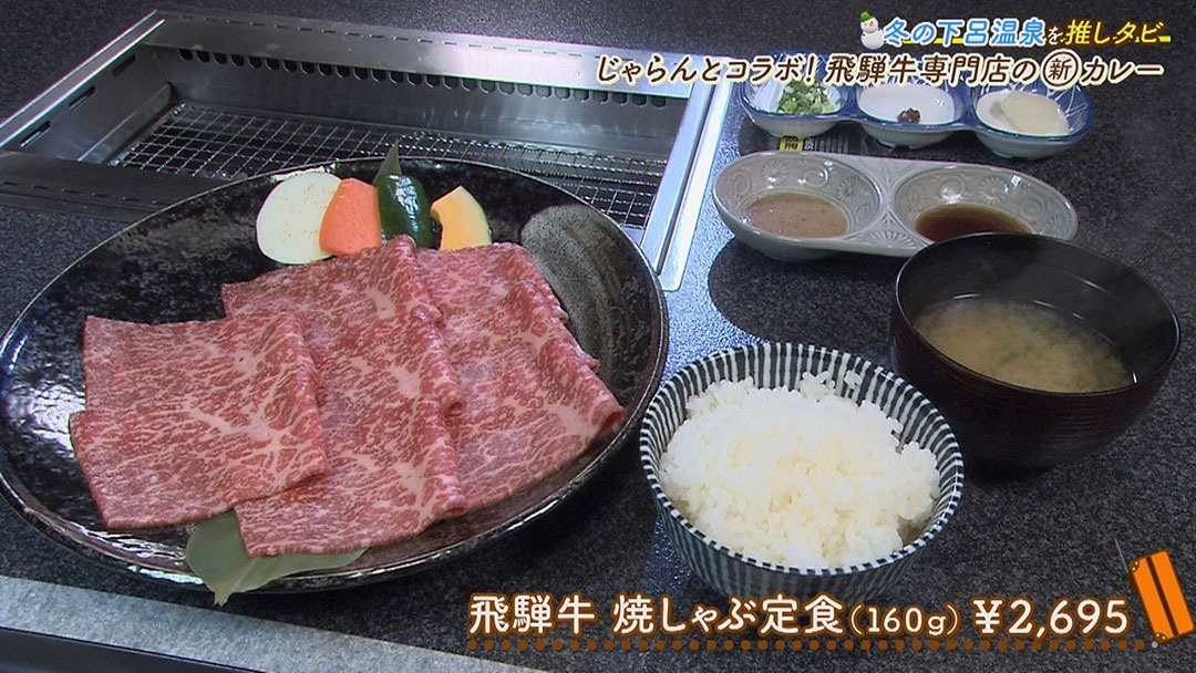 飛騨牛焼肉専門店の『飛騨牛・焼肉 ジュージュ』。飛騨牛をしゃぶしゃぶのようにサッと炙っていただく名物の『飛騨牛 焼しゃぶ定食(160g)』(2,695円)などが楽しめます。