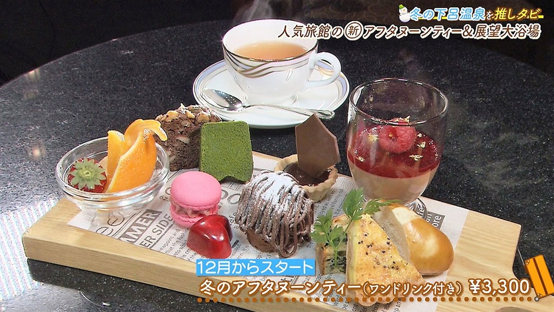 下呂屈指の人気を誇る『下呂温泉 水明館』。露天風呂や展望風呂など3つの大浴場が自慢の老舗旅館です。こちらで今年12月から始まったのが、1日20食限定の『冬のアフタヌーンティー(ワンドリンク付き)』(3,300円)。