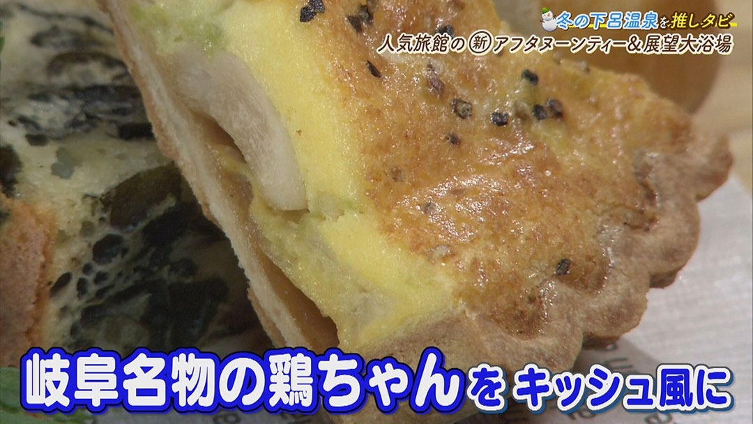 京都から取り寄せた抹茶を使ったテリーヌや、岐阜名物の鶏ちゃんをアレンジしたキッシュなど、食材にこだわり抜いたスイーツとお惣菜がいただけます。ドリンクは、紅茶やハーブティーなど7種類の中から選べ、優雅なひとときを過ごせますよ。みなさんも、冬の下呂温泉を満喫してみてはいかがでしょうか。