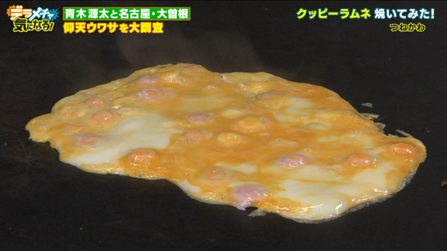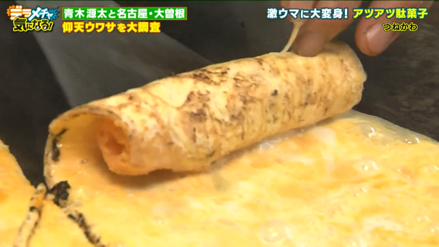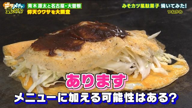 ラムネの香りが広がりスイーツみたいな感じに。駄菓子のプロには少し酸味が強かったようですが、見た目も可愛くなかなかの仕上がりとなりました。続いて青木アナが選んだみそカツ風駄菓子を料理。薄焼き玉子に焼いたみそカツとキャベツを載せ、パタンと半分折りに。さらに仕上げに八丁みそを使ったおでんのみそダレをかけて『源太焼き』の完成です。