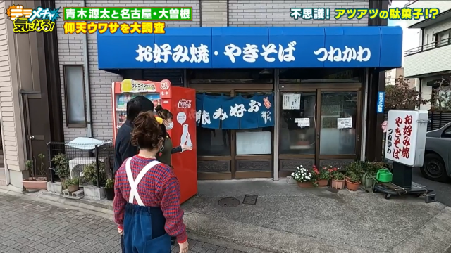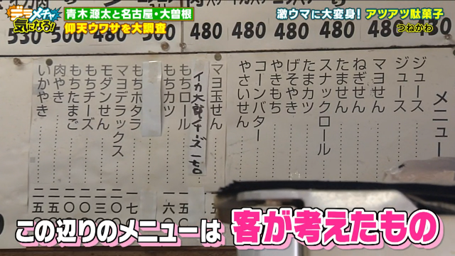 昔懐かしい駄菓子の数々に、三人の話も弾みます。三人が訪れたのは昭和50年創業の『つねかわ』。お店を切り盛りする恒川幸子さんが25歳の時に始めたお店です。開業当初はお好み焼きと焼きそばのみのお店だったそうですが、お好み焼きを買いに来た子どもたちから『お菓子も置いて』と言われたことがきっかけで駄菓子も扱うようになったんだそうです。それから47年、今も変わらず子どもたちの憩いの場になっています。壁に貼られたメニューの中で、青木アナが気になるものを発見。