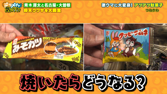 そこで村上と青木アナも新たなメニューの開発にチャレンジ!名古屋出身の村上はクッピーラムネ、岡崎出身の青木アナはみそカツの駄菓子を選択します。