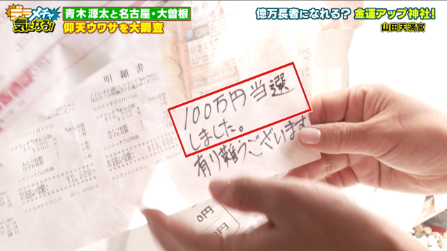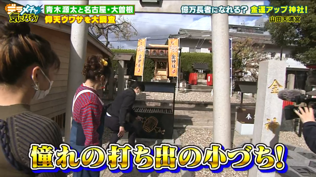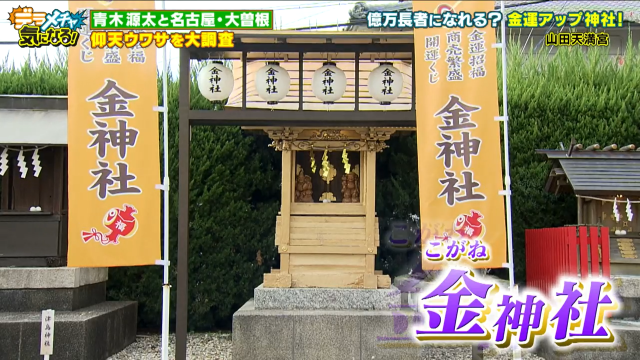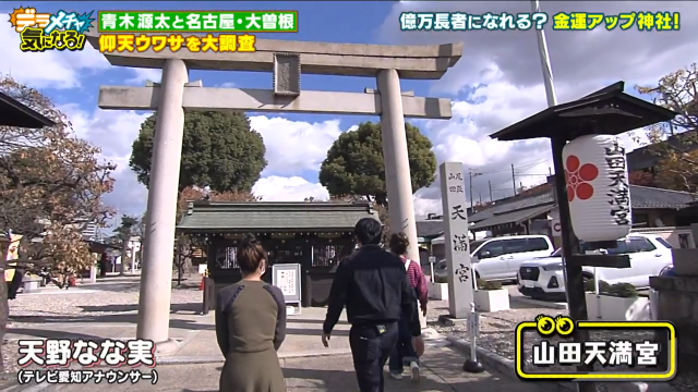 三人が最初に調査するのは『お金持ちになる神社があるらしい』というウワサ。岡崎出身の青木アナも尾張のことまでは知らなかったようで、興味津々の様子です。一行がやってきたのは大曽根駅から歩いて5分ほどのところにある山田天満宮。