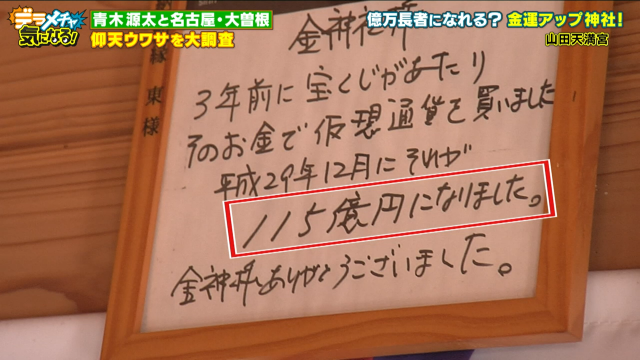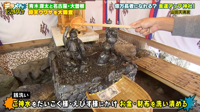 なんと115億円を手に入れた方も! これには三人も目を丸くしていました。そんな『金神社』のパワーを受け取る独特の参拝方法が『銭洗い』。大黒様やえびす様にご神水をかけ、そのご神水でお金やお財布を清めることで金運アップの御利益にあやかれることができます。