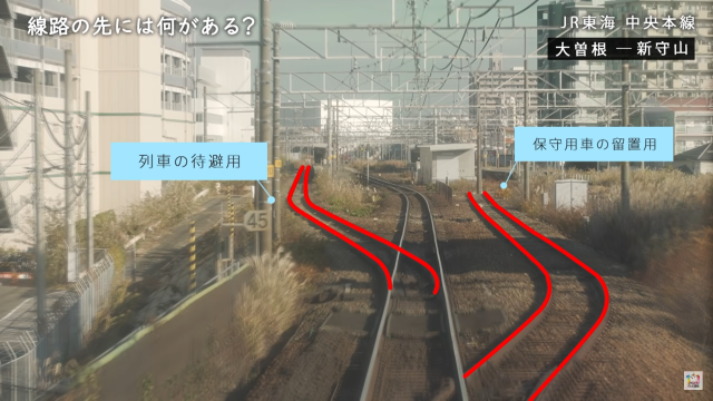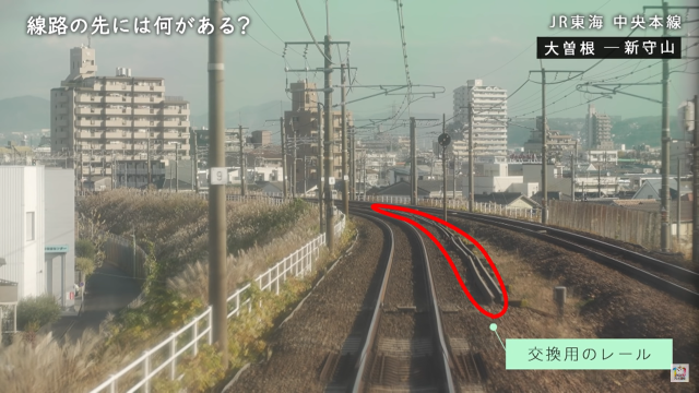 このレールは『交換用のレール』。レールを運んできて荷下ろしして取り替えるまでを連続して作業すると多くの時間が必要となり、限られた保守の時間内に終了させることができません。このため、予め交換用のレールを運んできて仮置きしているんだそうです。さらに列車が進むと、新守山駅の手前で再び側線が見えてきました。左側は特急列車などが本線を通過する際に待避するための線路。右側の線路は保守用車の留置するための線路とのことです。