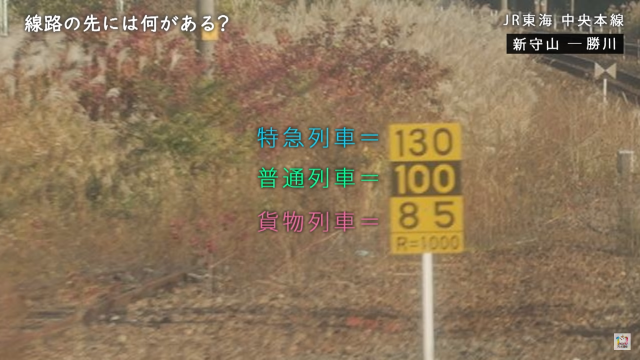 上の「130」は特急しなの号の制限速度130キロ、下の「85」は貨物列車の制限速度85キロを表しているとのこと。この回送列車は真ん中の「100」に従い制限速度100キロで進んで行きます。カーブを抜けたところには白と黒の不思議なマークがありますが、これが先ほどのカーブの制限速度を解除する標識です。