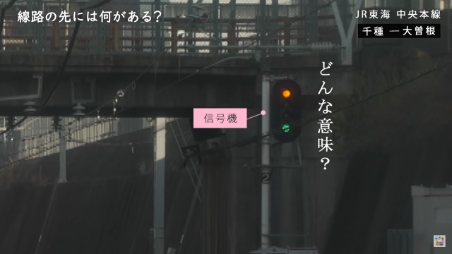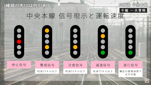 黄色と緑色の組み合わせであるこの信号は『減速信号』。中央本線では75キロ以下で走行することを指示しているものとなります。JR東海では5種類の信号を使い分けており、減速信号以外では赤色一つで『停止信号』、黄色二つで速度が25キロ以下を示す『警戒信号』、黄色一つで55キロの速度制限となる『注意信号』となります。