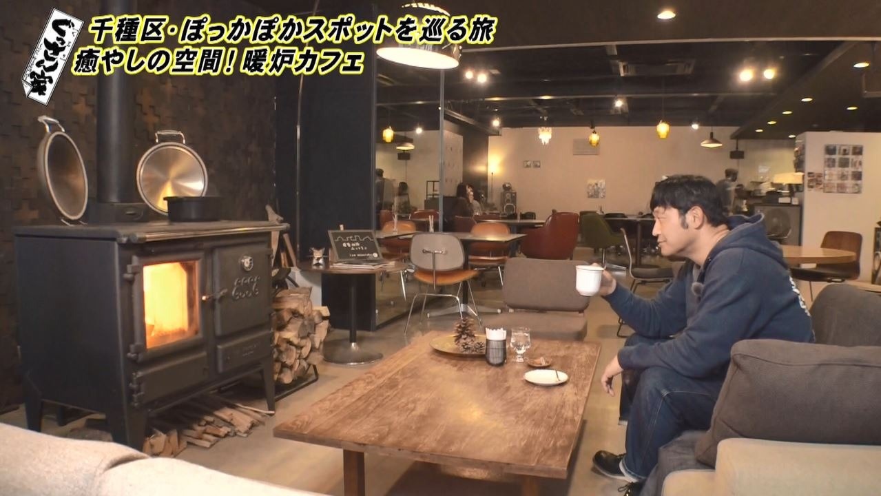 ホットコーヒーをいただきながら「いい時間ですね。コーヒー美味しい!これ贅沢やな~。ちょっと自分に酔えるもんな、ここ。燃えている火を見ながらコーヒー飲むって格別やな」と極上の時間を満喫します。