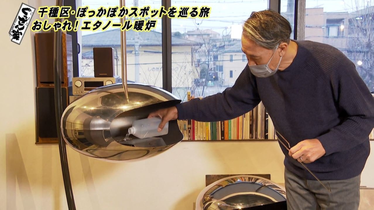興味津々のぐっさん、お願いして火をつけてもらいます。楕円形のボールのような形の暖炉は、エタノールの液体燃料をバーナーの中に注いで火をつけます。
