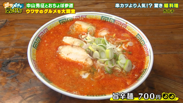 そして今では親子が作る多彩なメニューで、「百合子」はおちょぼ参道の繁盛店に。中でも大人気のメニューがあるそうで、早速作ってもらいました。それがこちらの『旨辛麺』。串カツを食べずにこれを食べに来ると言う人がいるほどの人気メニューだそうです。