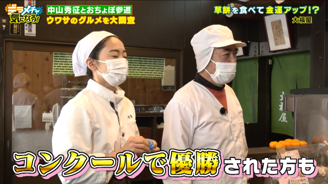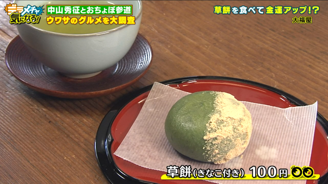 続いて三人が検証するウワサは「金運がアップするお饅頭があるらしい」。おちょぼさんの参道でお饅頭と言えば草餅、串カツに並ぶ人気の名物です。しかし、草餅で金運アップとはいったいどういうことでしょうか?金運アップの草餅を訪ねてやってきたのが大福屋。