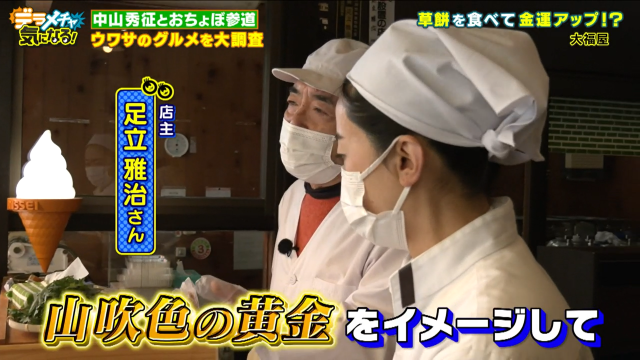 店主の足立雅治さんによると、草餅についたきな粉は『山吹色の黄金』をイメージしているとのこと。これを食べて金運がアップしたというお客さんもたくさんいらっしゃるそうです。