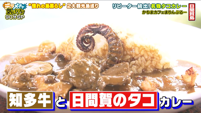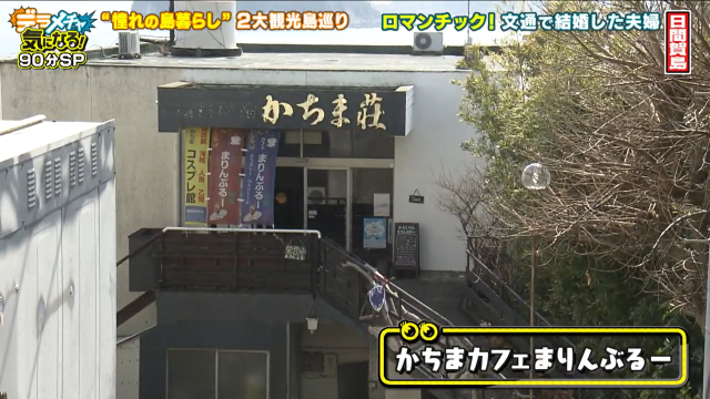 「魂の声を聞いてここに住めるかどうかを決めた」と話す多恵子さん。すると、当時小さなカフェを営んでいた千洋さんが目の前を通る多恵子さんを発見!しかし、お店にお客さんがいたため後を追いかけることが出来なかったんだそうです。そんなドラマチックな出来事の後に結ばれた二人は、二人三脚で旅館を経営。子供が巣立った今はカフェを静かに営んでいらっしゃいます。お二人が営む『かちまカフェまりんぶるー』の看板メニューは島の名産であるタコを使った『タコカレー』。