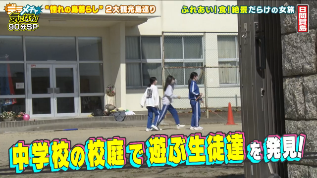 知多牛とタコの唐揚げが入ったご夫婦自慢のカレーがデラメチャ絶品! カレーとタコの相性の良さに久本が驚きの表情を見せていました。日間賀島に行ったら『タコカレー』とご主人の遊び心を味わいにぜひ立ち寄りたいお店に出会いました。潮騒を聞きつつ憧れの島暮らしを妄想しながらブラブラと歩く三人。すると、校庭で遊ぶ島の中学生達を見つけます!