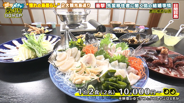 紹介した商品など:1泊2食(2名)…10,000円~ ※映像のゆでタコとタコしゃぶは4名分