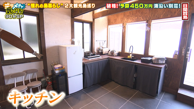 島から帰ってきた旦那さんから「土地買ったわ」と言われた奥様の返事は「は?」の一言。これは無理ないですよね。もともと建っていた古びた建物を島の大工さんと二人三脚で改装し、週末を楽しむ別荘に大変身。購入から改装までの費用を含め450万円、本当に驚きです!素敵に改装された気になる室内を見学させてもらうと、週末の島暮らしを楽しむ工夫がいっぱいでした。まず目についたのは入り口すぐに設置された開放的なキッチン。