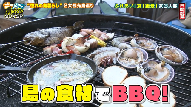 土地代を含めて450万円以内で夢の島暮らしを叶えることができるとあって、久本も想像を膨らませていました。そんな島暮らしのイメージをさらに膨らませるため、片岡さんのご好意でバーベキューをすることに。もちろん主役は島の新鮮な魚介たち。中でもオススメなのがタイラ貝!