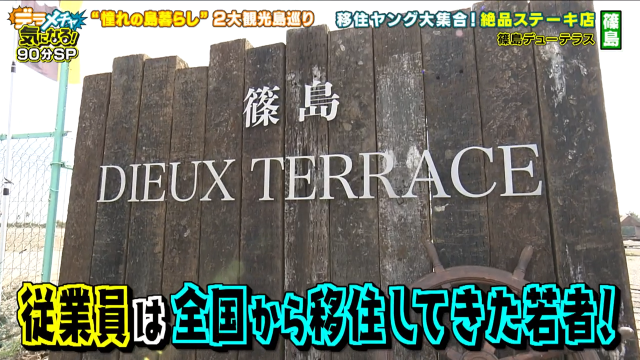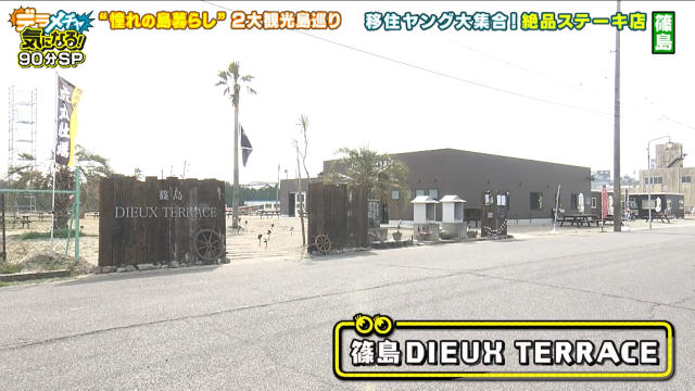 「海が見えるところに本当に物件を探している」と本気で島暮らしを考える高橋。今回のロケ次第では島暮らしが現実的になるかもと胸を躍らせています。テンションが上がっていつもよりおしゃべりになっている高橋とともに、4人が篠島で最初に訪れたのが昨年11月にオープンしたステーキハウス「篠島 DIEUX TERRRACE(デューテラス)」。
