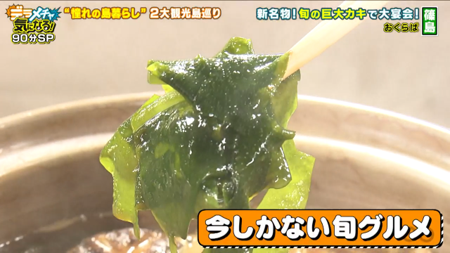 高橋が鍋をオープンすると中からは現れたのはプリップリの牡蠣! 実は篠島では3年前から本格的な牡蠣養殖がスタート。篠島の牡蠣は身はプリップリで大きく、強い旨味とさっぱりとした味わいが特徴です。そんな絶品牡蠣を篠島の定番という味噌鍋で頂く『おくらば』の看板メニュー。一口では食べられないほど大きくてぷりっぷりな牡蠣の美味しさに、四人は収録も忘れて真剣に食べてしまうほど!そして今が旬という島の生ワカメ。さっと味噌つゆにくぐらすと鮮やかな緑になり、美味しさもひとしおです。