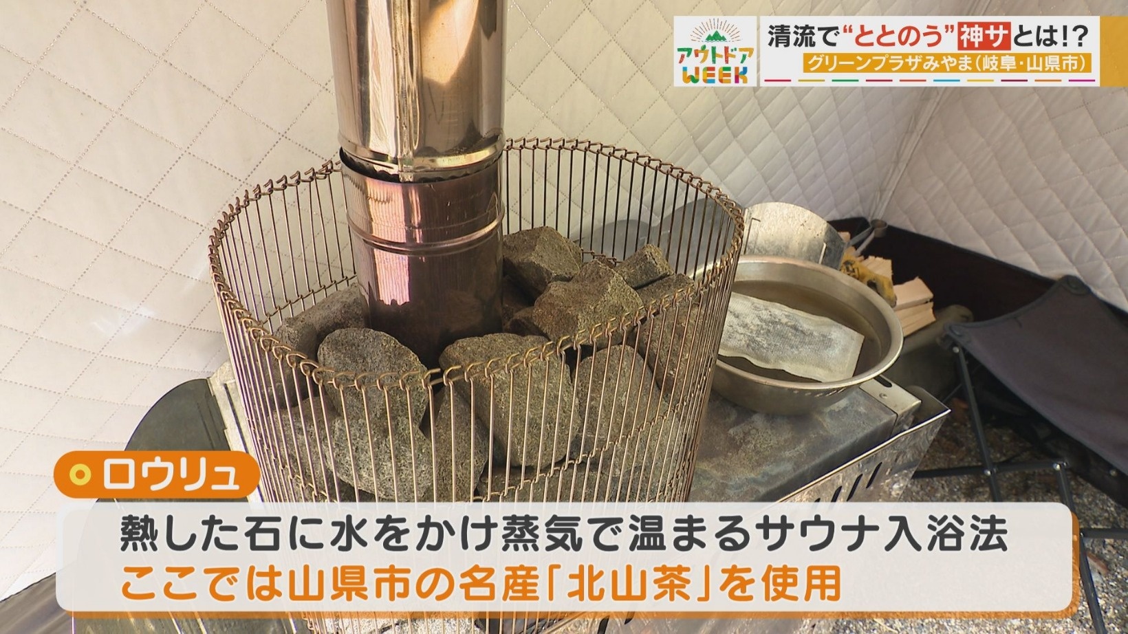 神サでは、水のかわりに山県市の名産「北山茶」を使用。蒸気がフワッと上がり、少し遅れて熱くなってきます。お茶の香りの中、湿度が高まり、血行が促進され、たっぷり汗をかけます。