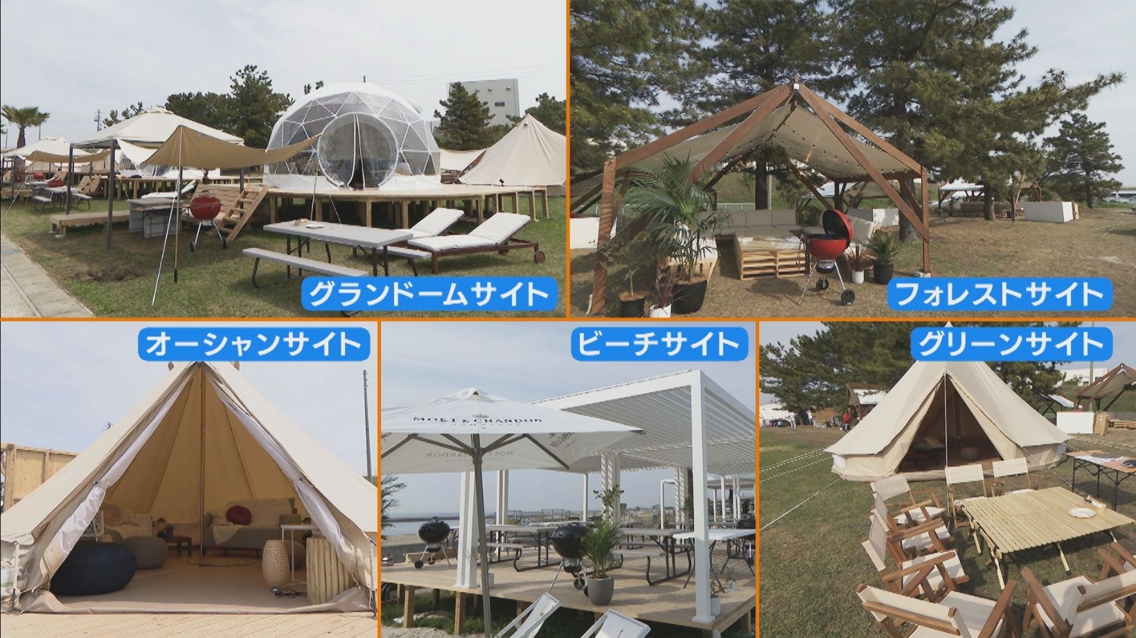 カジュアルアウトドアから贅沢なリラックス空間まで、テーマの異なる5つのサイトに分かれ、「グランドームサイト」「フォレストサイト」「オーシャンサイト」「ビーチサイト」「グリーンサイト」ととってもオシャレ。テーマごとにムードや楽しみ方が変えられます。海を一望できるグランドームサイトは、テント内にシャンデリアやソファがあり、極上のリゾート気分が味わえます。