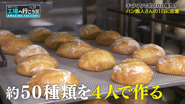 食パンなど大量生産の商品以外は多品種を少量で受注しているとのこと。そのため、これのパンはは生産ラインではなく、職人さんたちが丁寧に手作りしています。機内食のパンを作っているのは、ケータリング担当の職人さん。およそ50種類の業務用パンをわずか4人で作っています。
