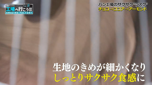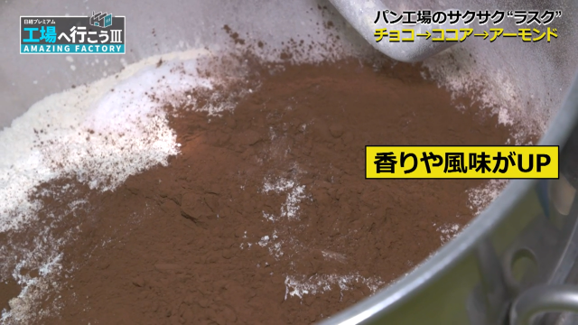 サクサク食感でたくさんのファンがいる『本間ラスク』の中で一番人気なのが、しっとり感も感じられるチョコレートラスク。その気になる製法も、今回の取材で密着しました。ラスクに使われるのは3種類の小麦粉をブレンドして作られるラスク専用のパン。チョコレートラスクの場合、生地にココアを混ぜることでさらに風味をアップしています。
