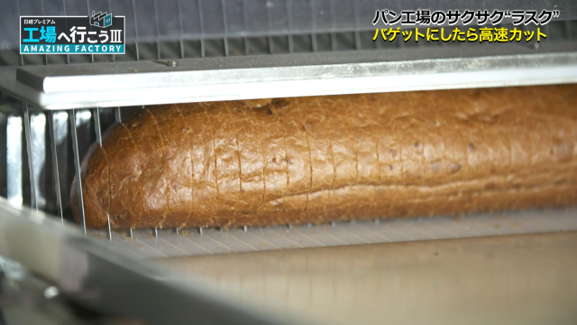 これを1日寝かせてなじませてから、専用のマシンで一気にバゲットをカット。機械だからこそ一律の厚みできれいにパンをスライスできるんですね。スライスされたパンは再びトンネル窯を通されて二度焼き。この二度焼きも美味しいサクサク食感を生み出す秘密です。