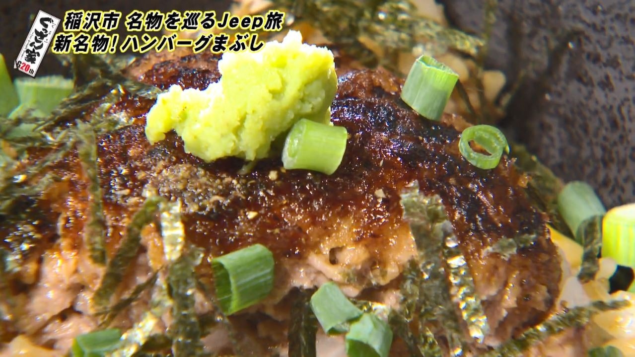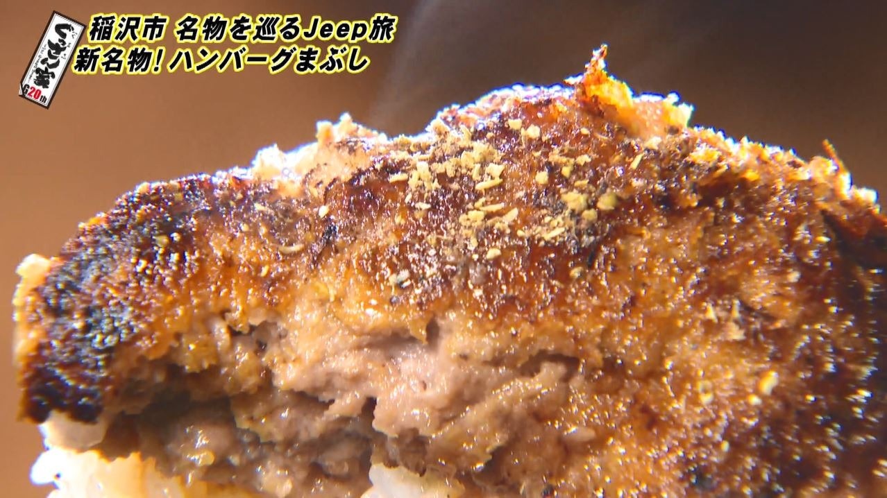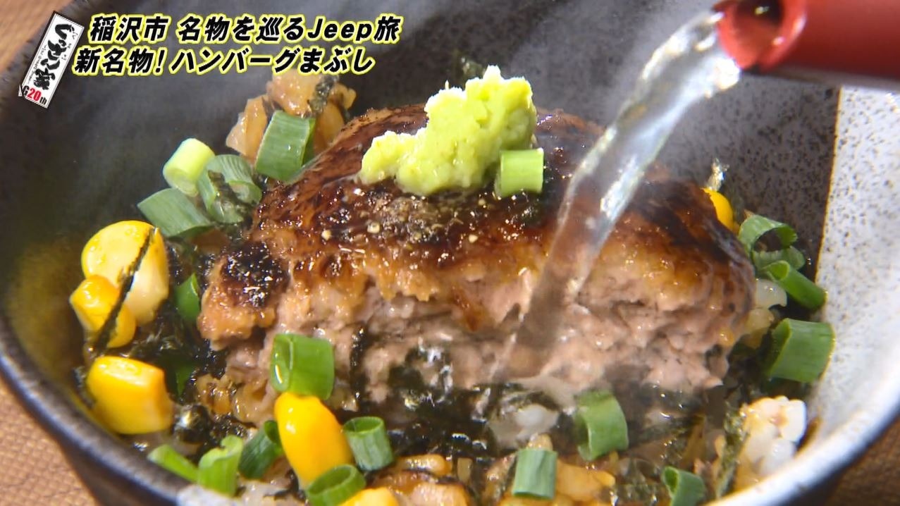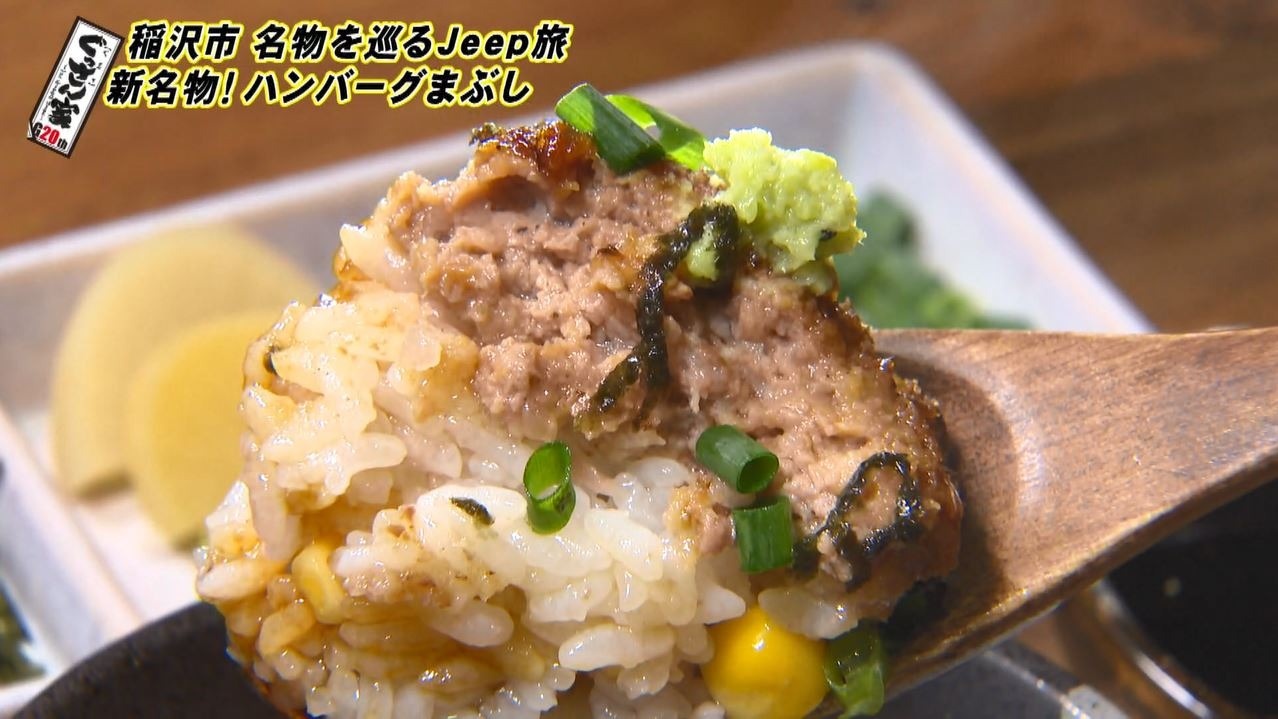 ここで連日完売というほど大人気の新名物が、店長の塩見さんが考案した『ハンバーグまぶし』(1150円)。おひつに詰めたごはんの上に大きなハンバーグをのせ、甘辛いカバ焼きタレと、コーン、アクセントに山椒を振りかけています。「なんか不思議!」と驚きを隠せないぐっさんですが…