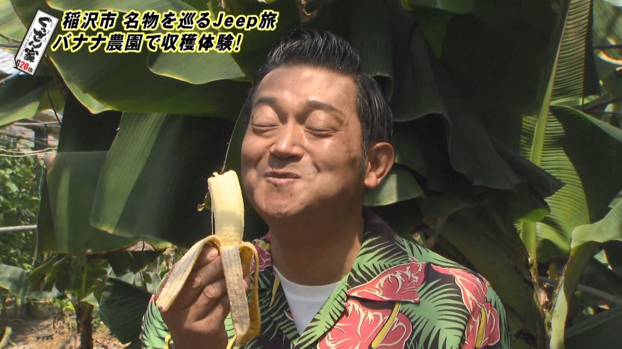 「すっげーおいしそう!」とバナナを頬張るぐっさん「ウホホッ!いつも食べているバナナと違うんですよね、甘味が。甘さの中にいろんな味が入っているバナナは初めて食べました」と感動!