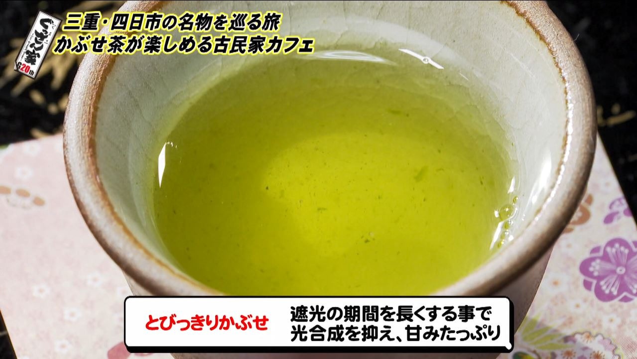 続いてやってきたのはお茶農家が営む『かぶせ茶カフェ』。実は四日市は伊勢茶の一大産地、中でも茶葉にシートをかぶせて渋みを抑えた『かぶせ茶』が知る人ぞ知る名物。