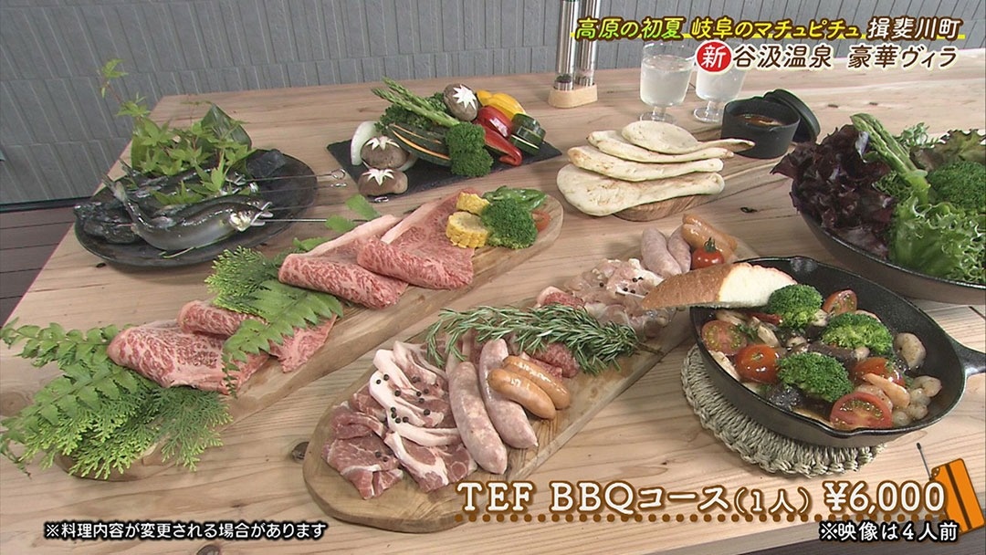 『TEF BBQコース』(1人6000円)は、極上の飛騨牛に、上品な甘みが特徴の飛騨旨豚(ひだうまぶた)、これから旬を迎える鮎などが味わえます。 ※画像は4名分、料理内容が変更される場合があります。雄大な自然の中で、非日常が味わえること間違いなし!