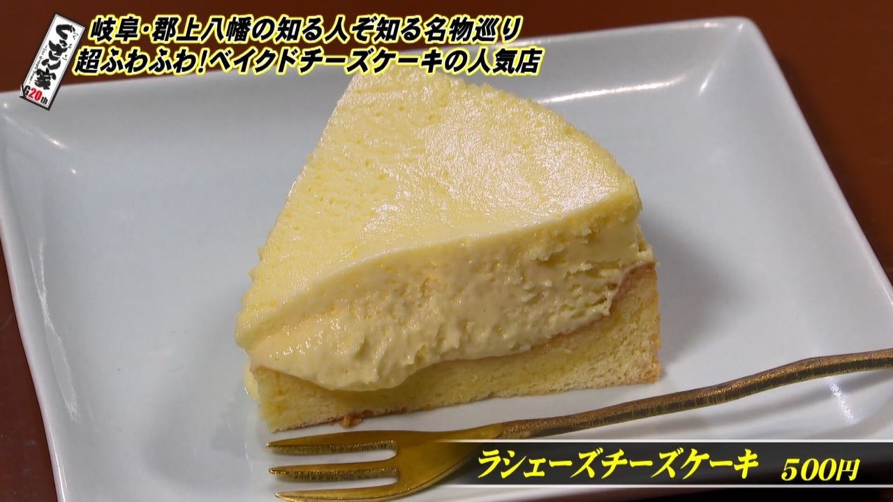 ひるがの高原で作られたチーズなどを使ったベイクドチーズケーキ『ラシェーズチーズケーキ』(500円)。“究極のやわらかさ”にこだわり、フワフワに泡立てた卵に、クリームチーズや生クリームなどを混ぜ合わせ、シフォンケーキに重ねて低温で焼き上げています。