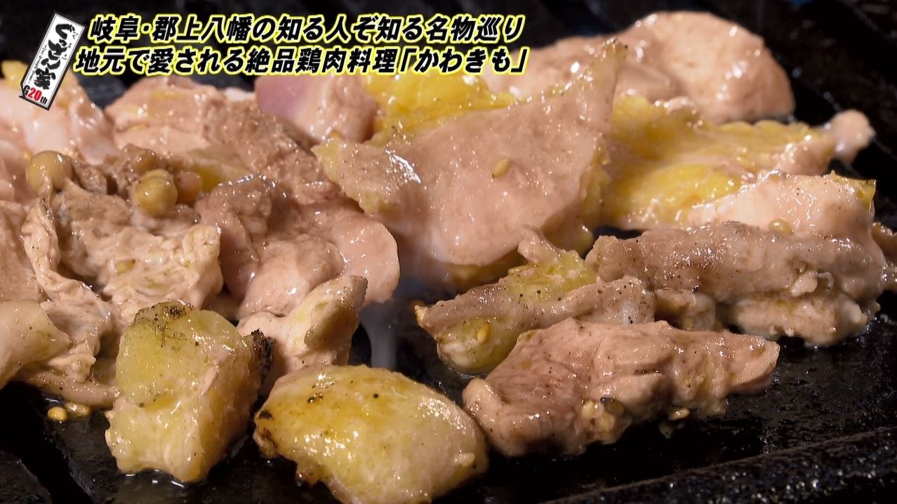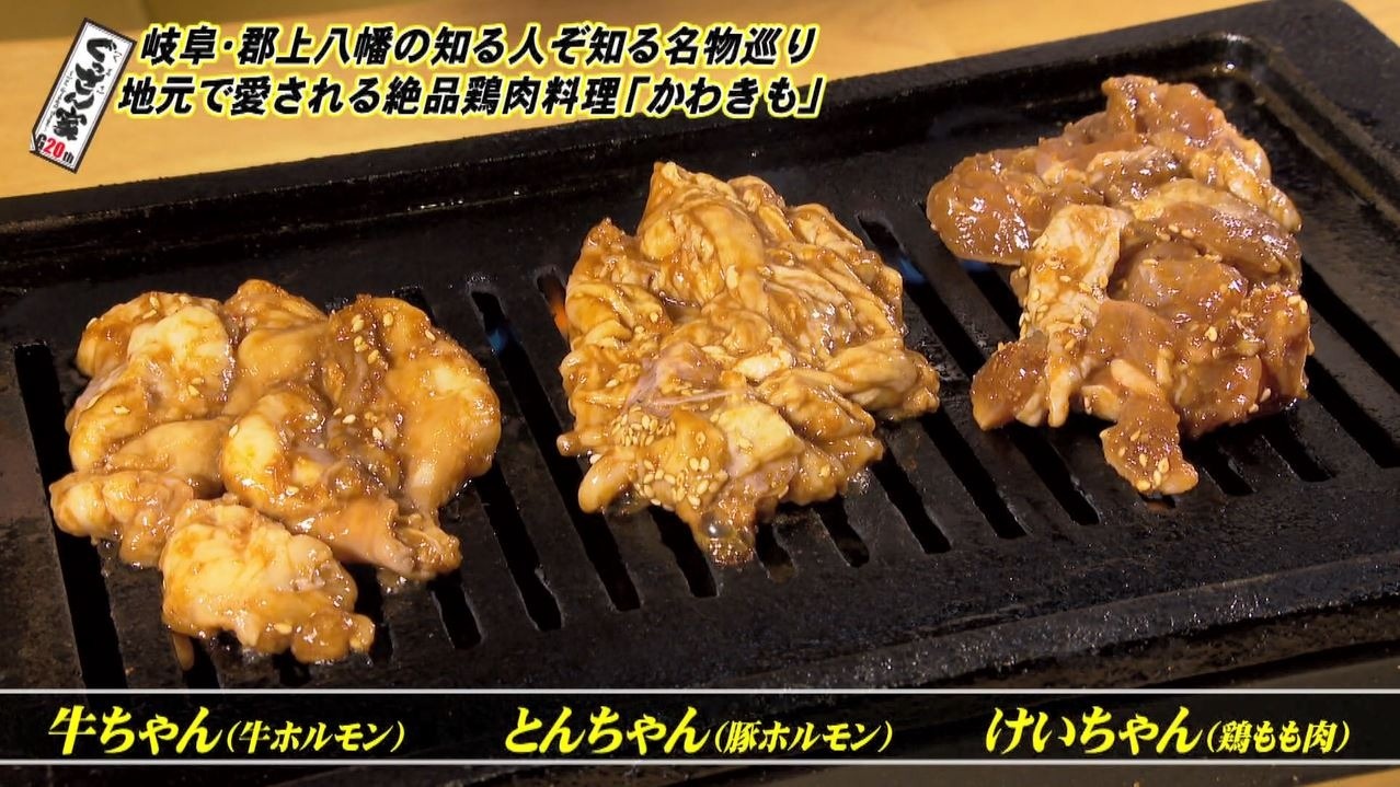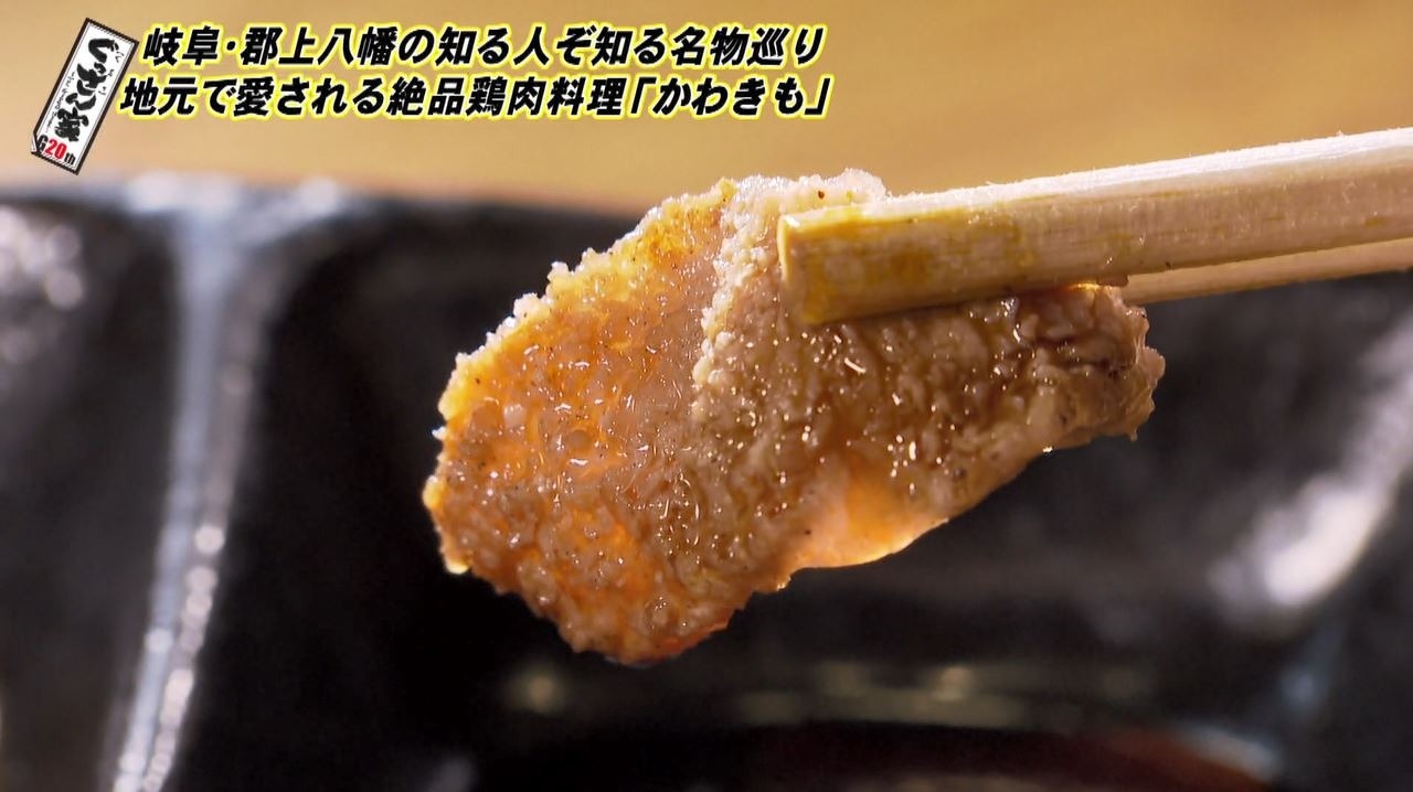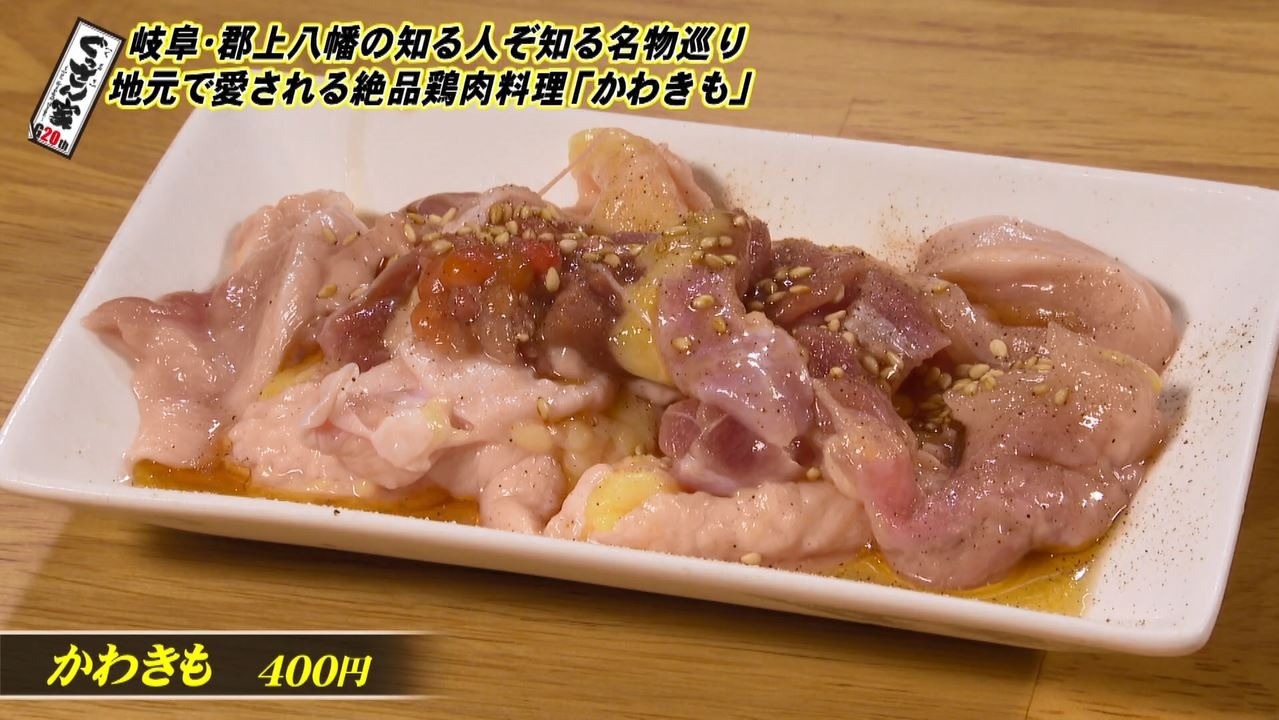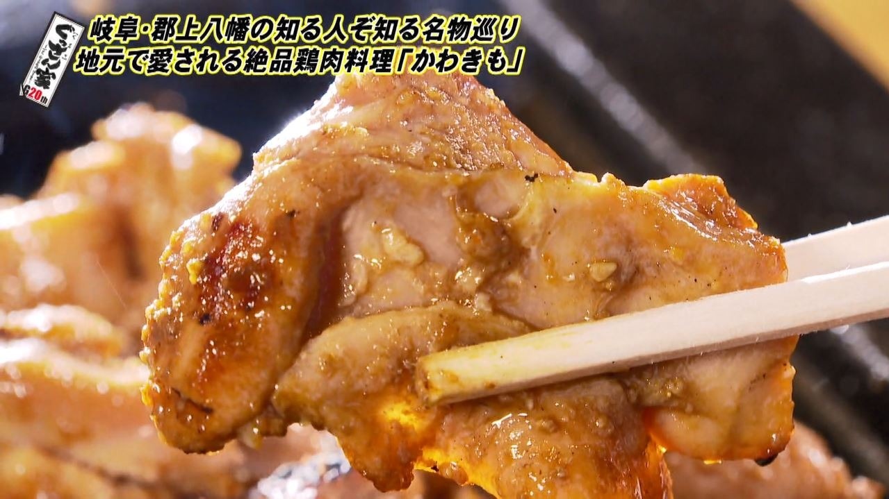 以前に訪れた時は『けいちゃん』をいただきましたが、今回は郡上の地元で愛される名物『かわきも』(400円)をいただきます。若鶏ではなく『ひね』と呼ばれる親鶏の皮や身、内臓を焼いて食べる料理で、ご主人によると「ちょっと鶏が固くなっているんですけど、味がめちゃめちゃ出る」そうで、ぐっさんも「歯ごたえあるやつ?めっちゃ好きですよ」とワクワク。
