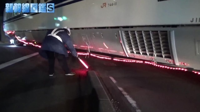 深夜の道を進む新幹線は赤いライトで照らされています。これも安全確保のための工夫。暗い道路でもはっきり車体を認識してもらうことで、事故などが起こらないようにしています。