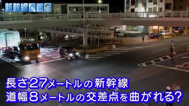 27メートルもある新幹線16号車に対して、交差点の道幅はわずか8メートル。果たしてどうやって曲がるのでしょうか?