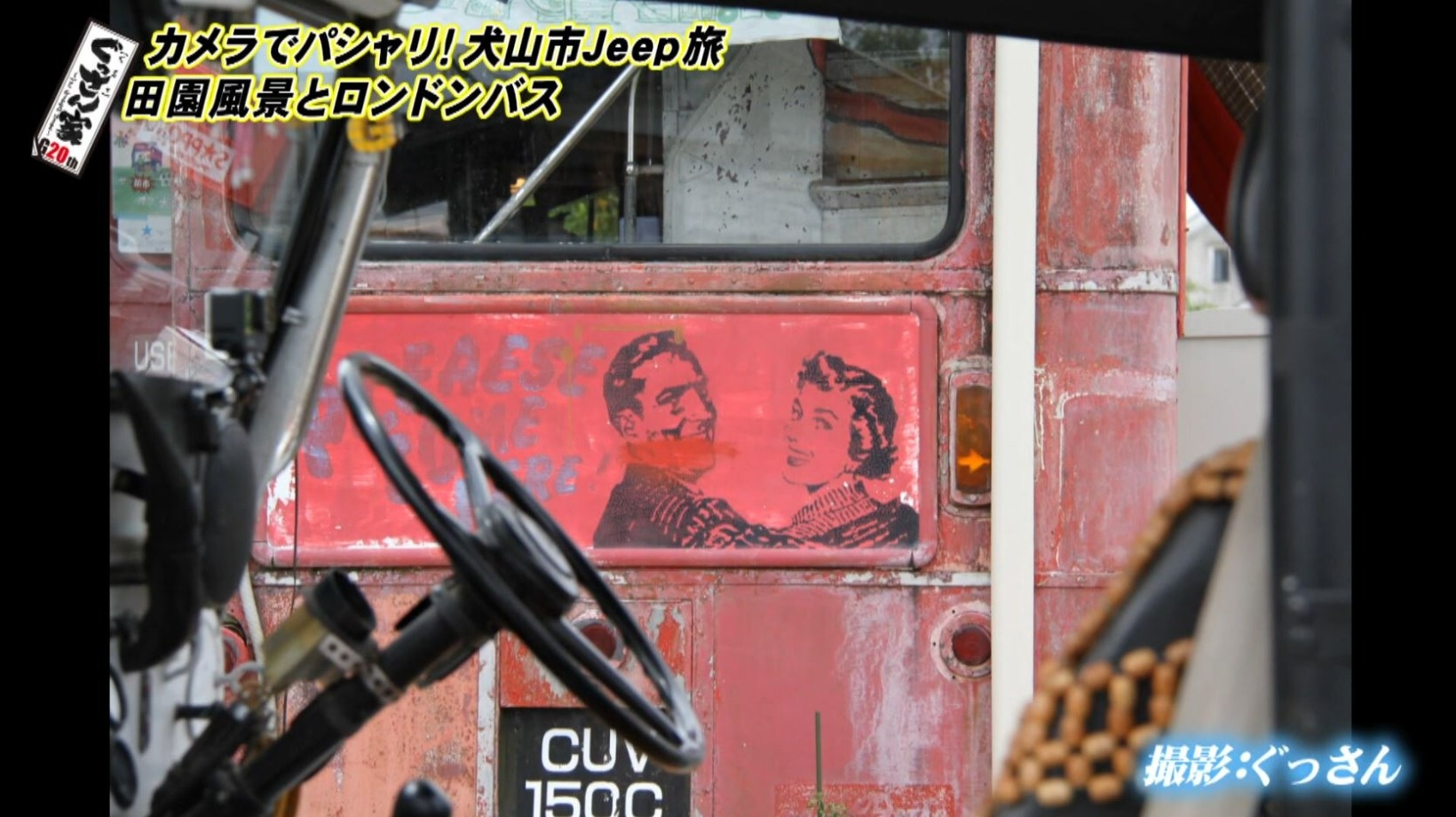 運転席のハンドル越しにロンドンバスを映した写真。「Jeepに乗ってた2人がレストランの中から愛車を見てるイメージ」だそうで、ぐっさんの感性が光ります。