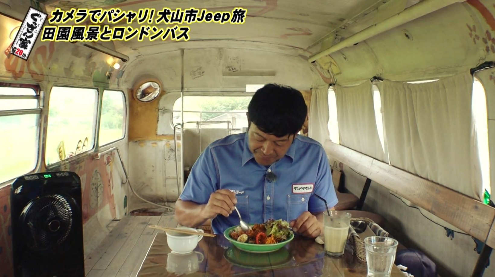 2階建てのバスは1階部分が厨房、2階部分が客席になっていて、ぐっさんも「はじめて!ロンドンバスの上。おもしろ~」と大興奮。